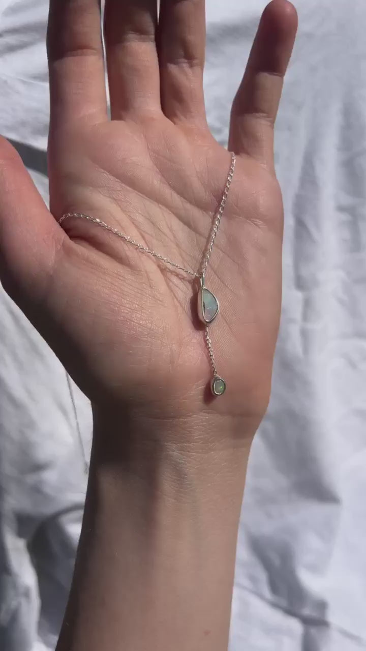 A delicate and otherworld pendant with two spectacular Australian opals. Inspired by sunlight playing in the air and creating rainbow prisms.