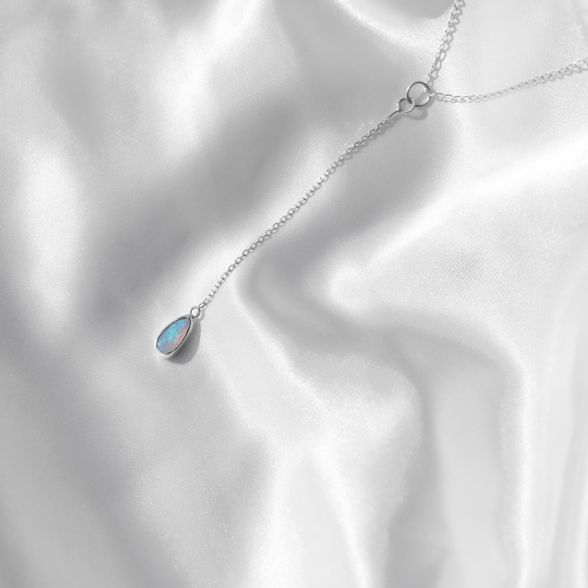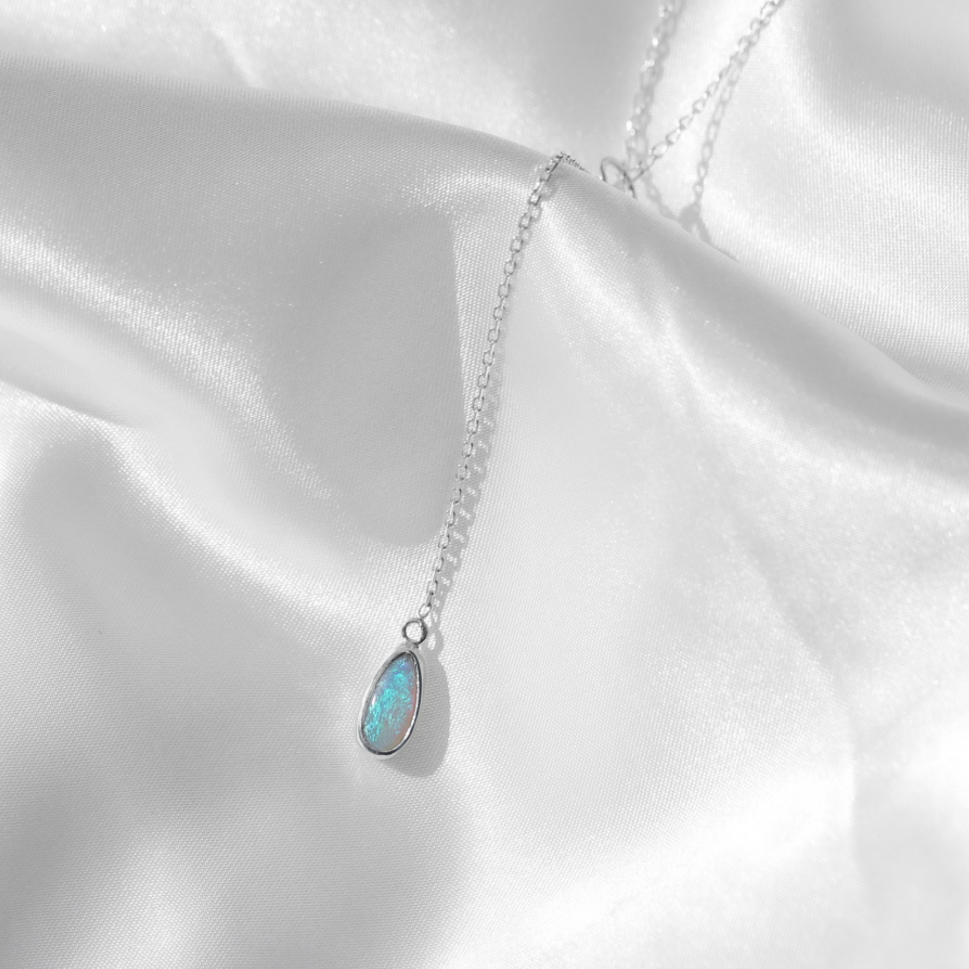 Inspired by a magic droplet, this delicate necklace features a stunning Crystal Coober Pedy Opal. It hangs nice and long around the neck and delicately drops 10cm in length.