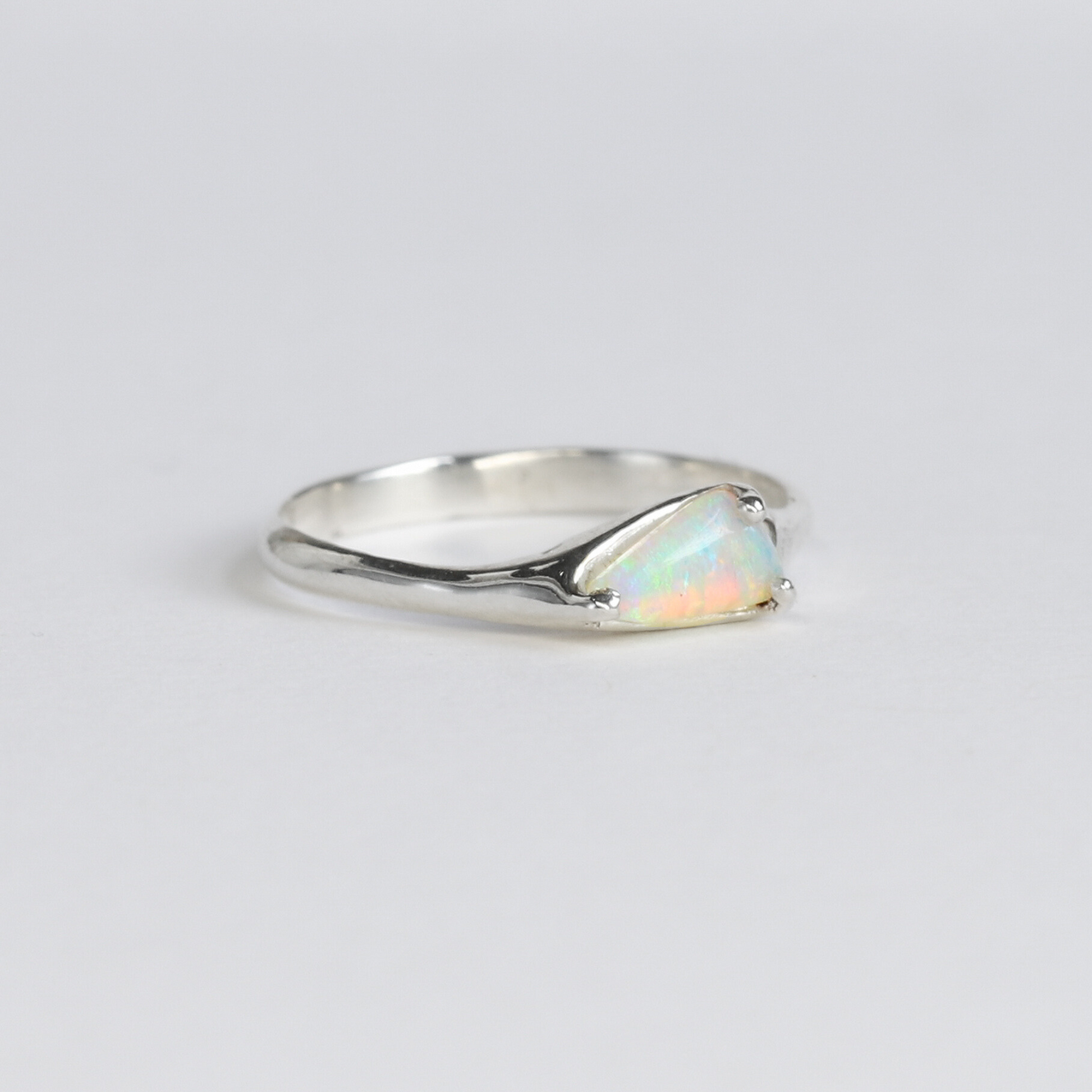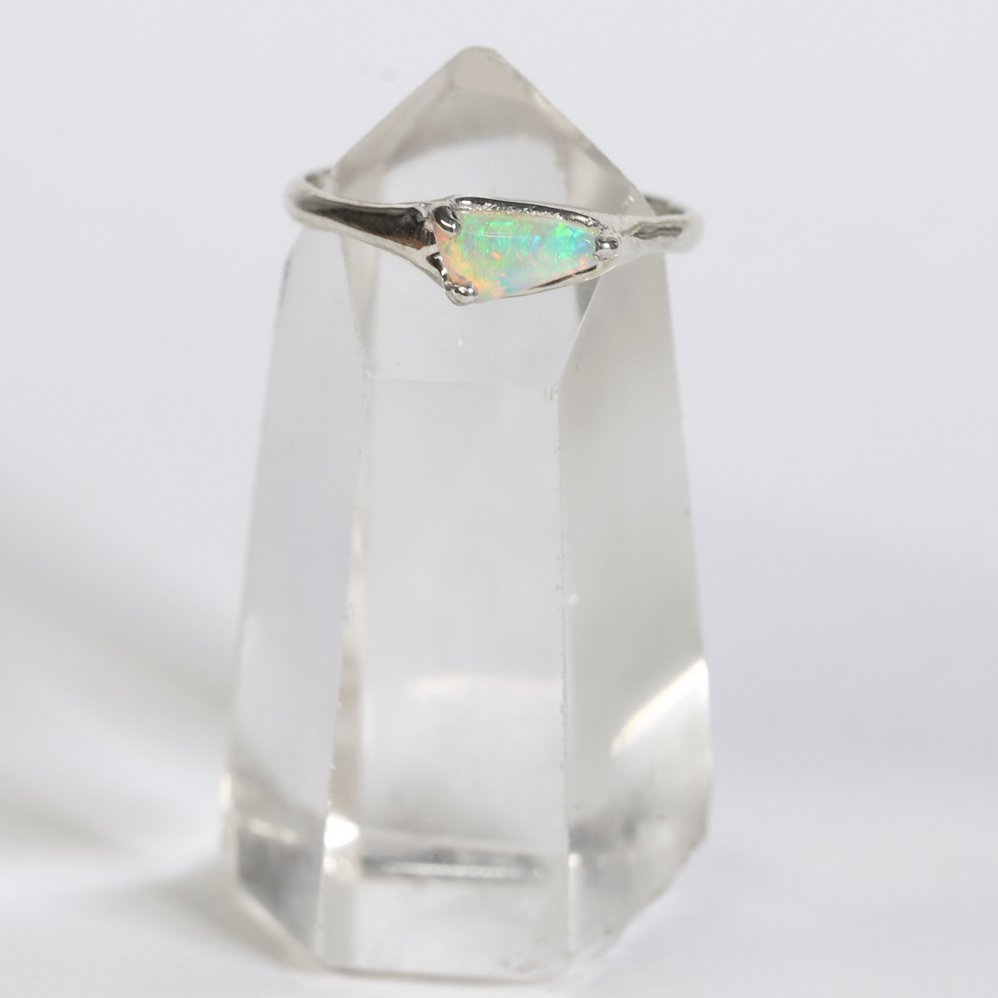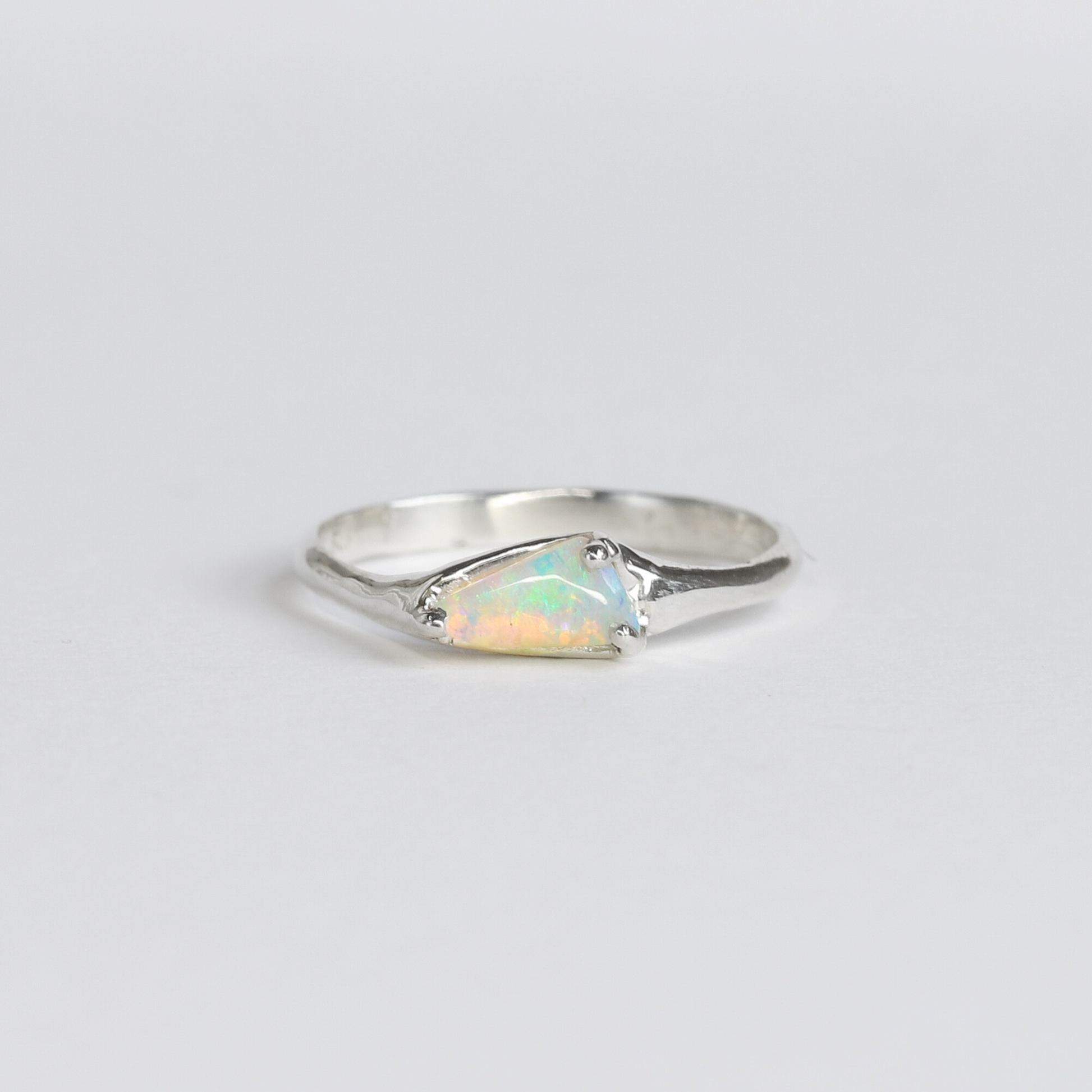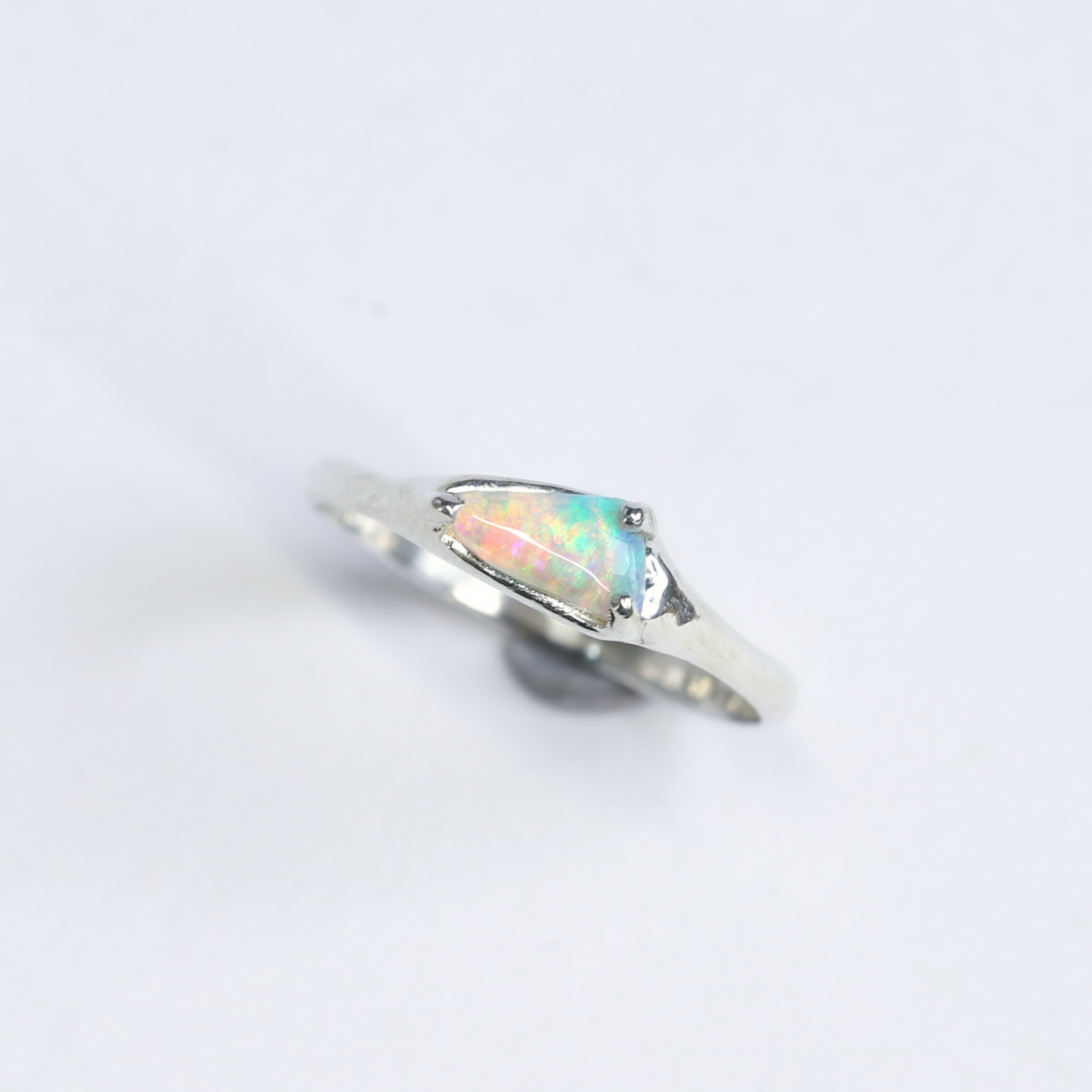 An elegant one of a kind opal ring, featuring a glowing Crystal Opal set in sterling silver created using the lost wax carving method.