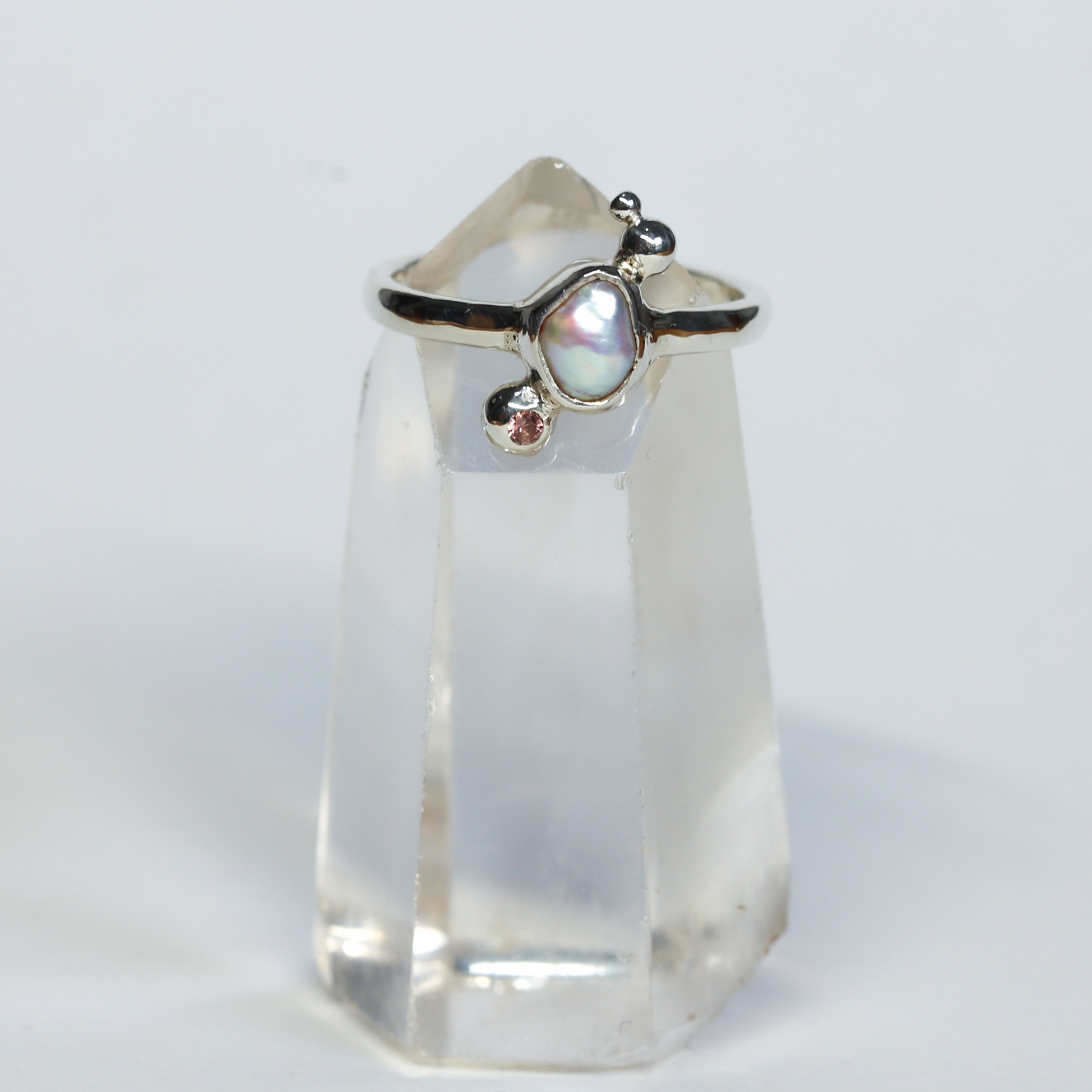 A unique keshi pearl thing in a delicate 2mm sterling silver band and sterling silver bubbles with one 1.5mm pink Australian Sapphire.