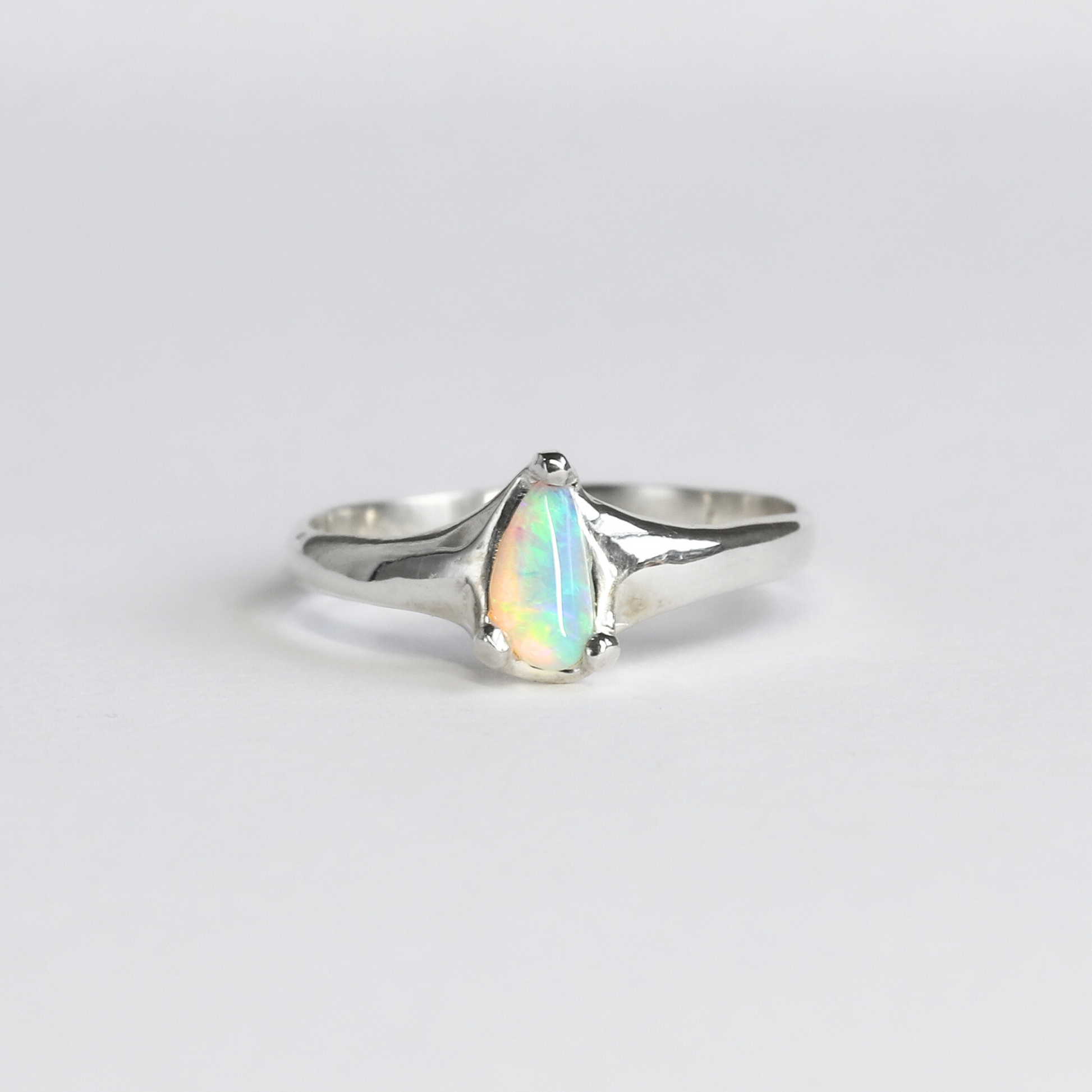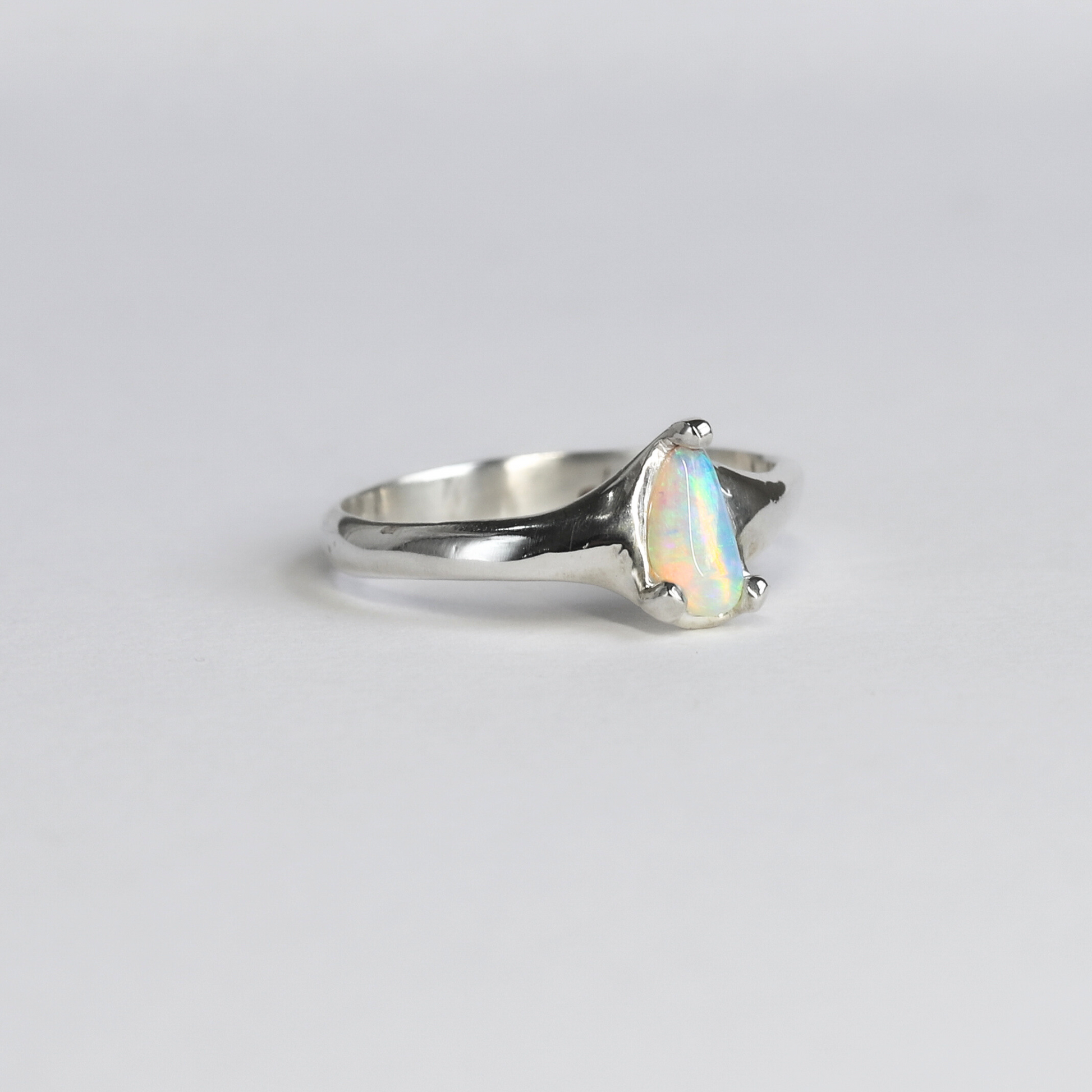 An elegant one of a kind opal ring, featuring a glowing crystal Coober Pedy Opal set in sterling silver created using the lost wax carving method.