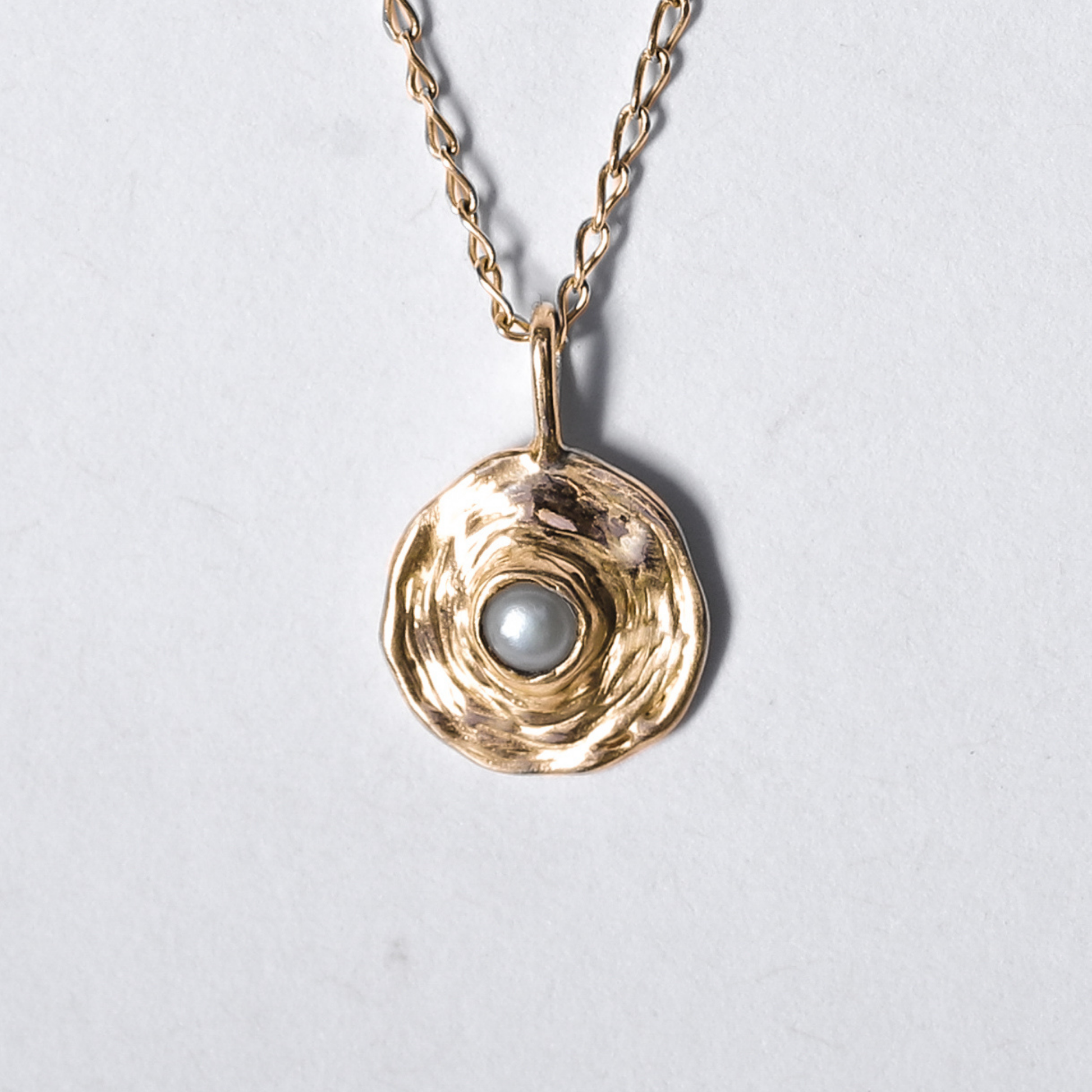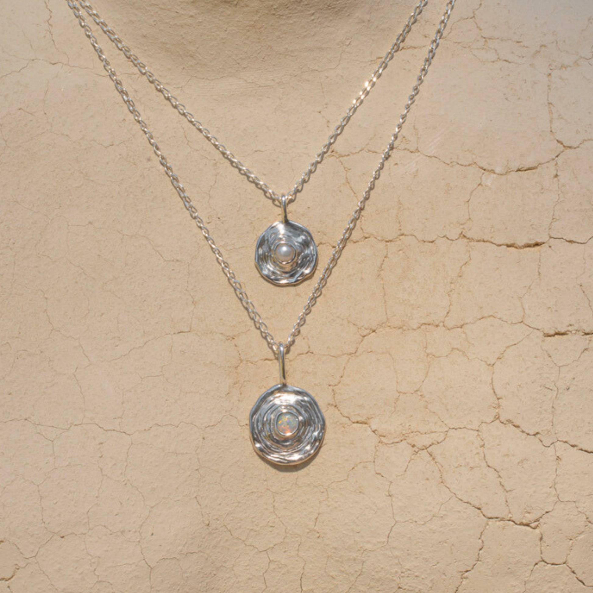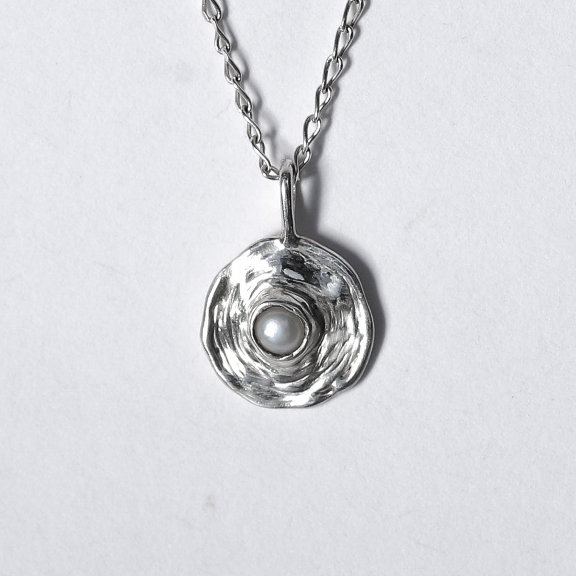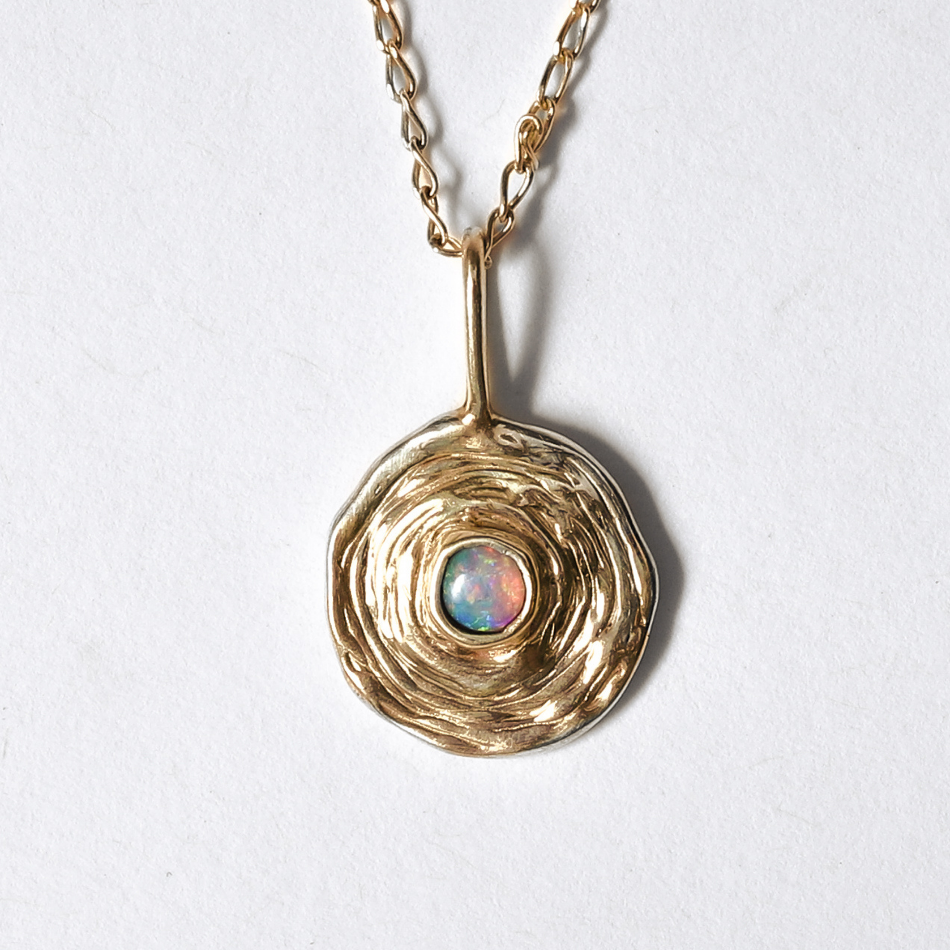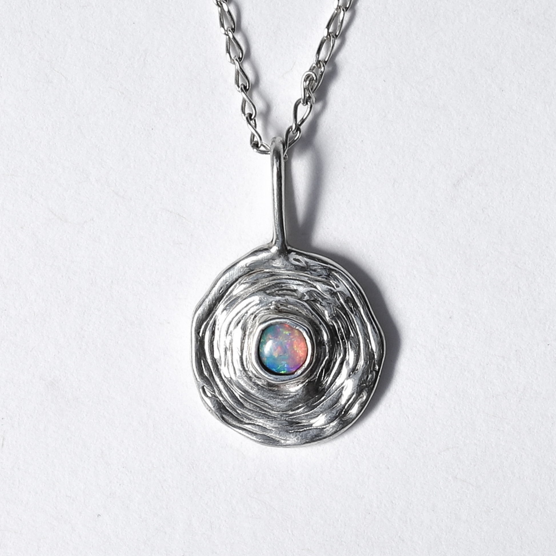 This delicate necklace features either a solid Coober Pedy (South Australian) crystal opal or delicate keshi seed pearl, dropped into a pool of sterling silver/gold. I was inspired by water ripples and the greater ripple effect of a word or an action.