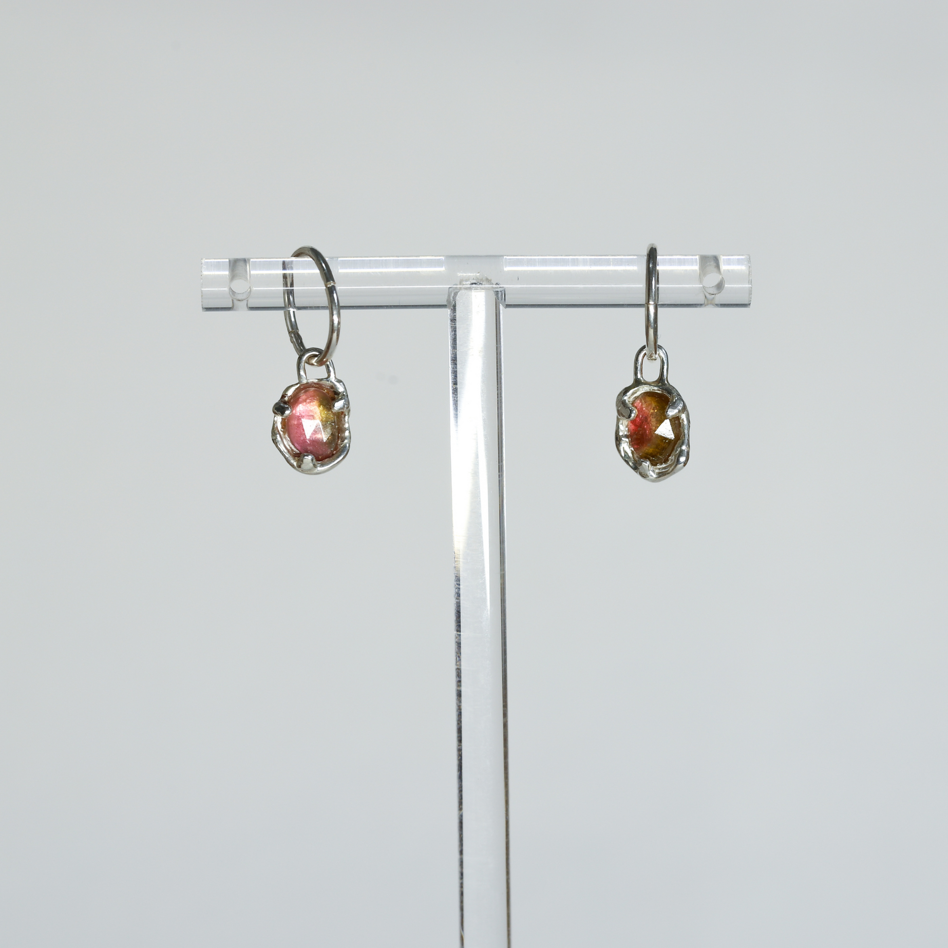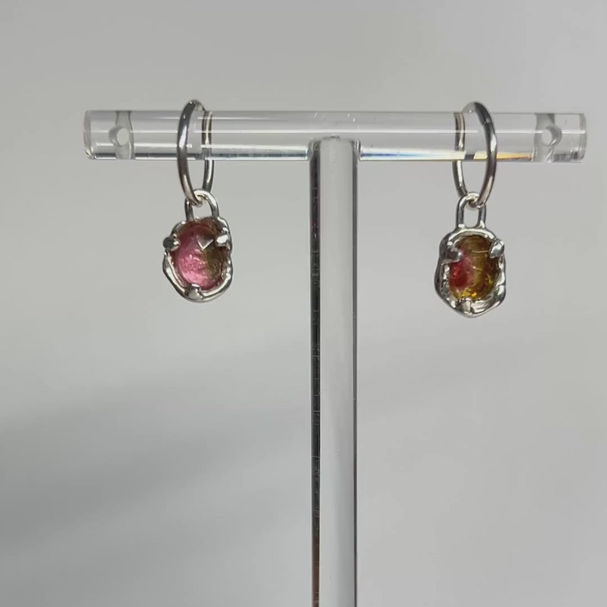 These hoop earrings feature one of a kind natural Watermelon Tourmalines, dropped into a pool of sterling silver/gold.